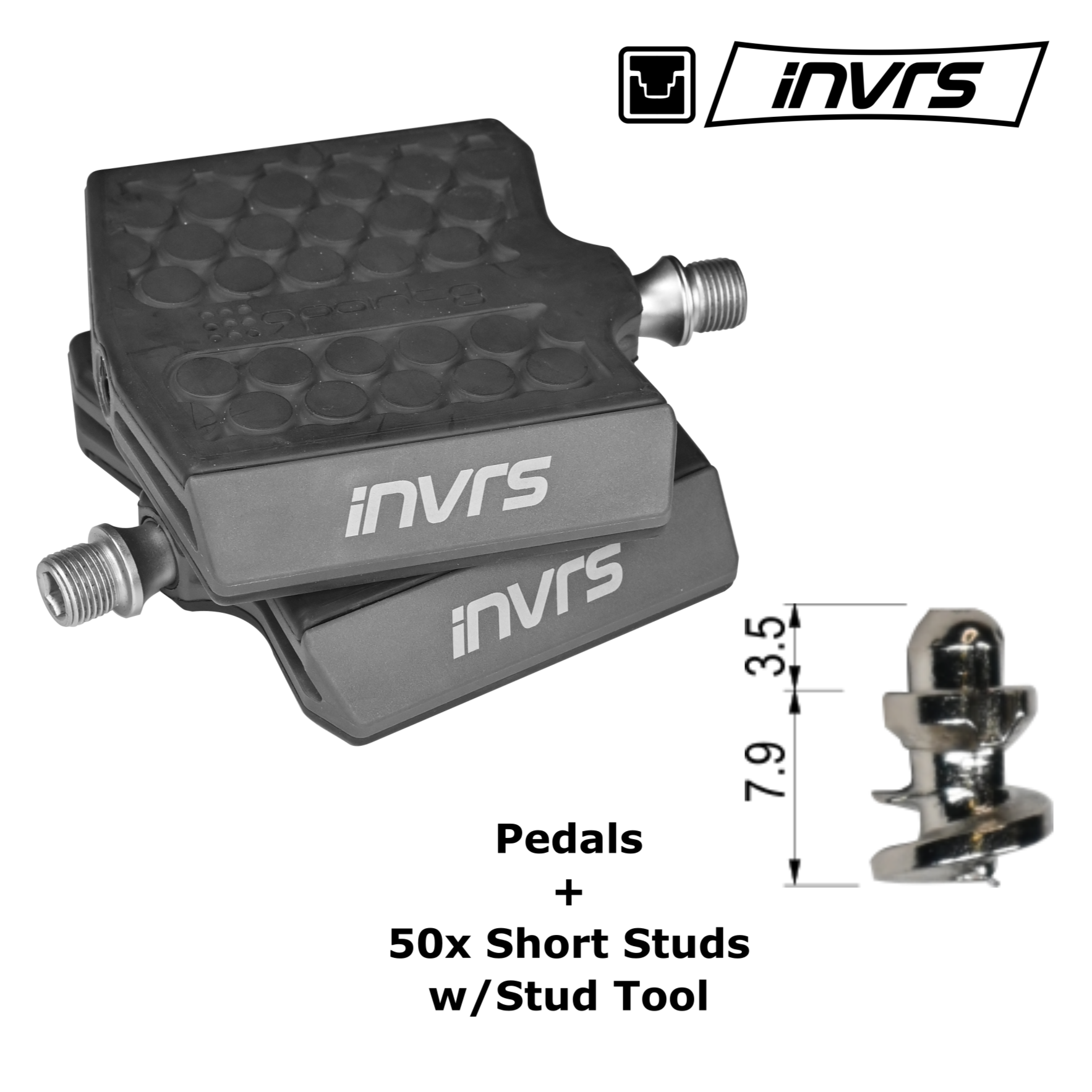 The iNVRS pedals (patent pending) have a conventional polymer body, alloy axle, bearings and seals. But the spikes have been replaced with a proprietary-compound, rubber surface, that is designed to grab onto studs in the sole of your riding shoes.